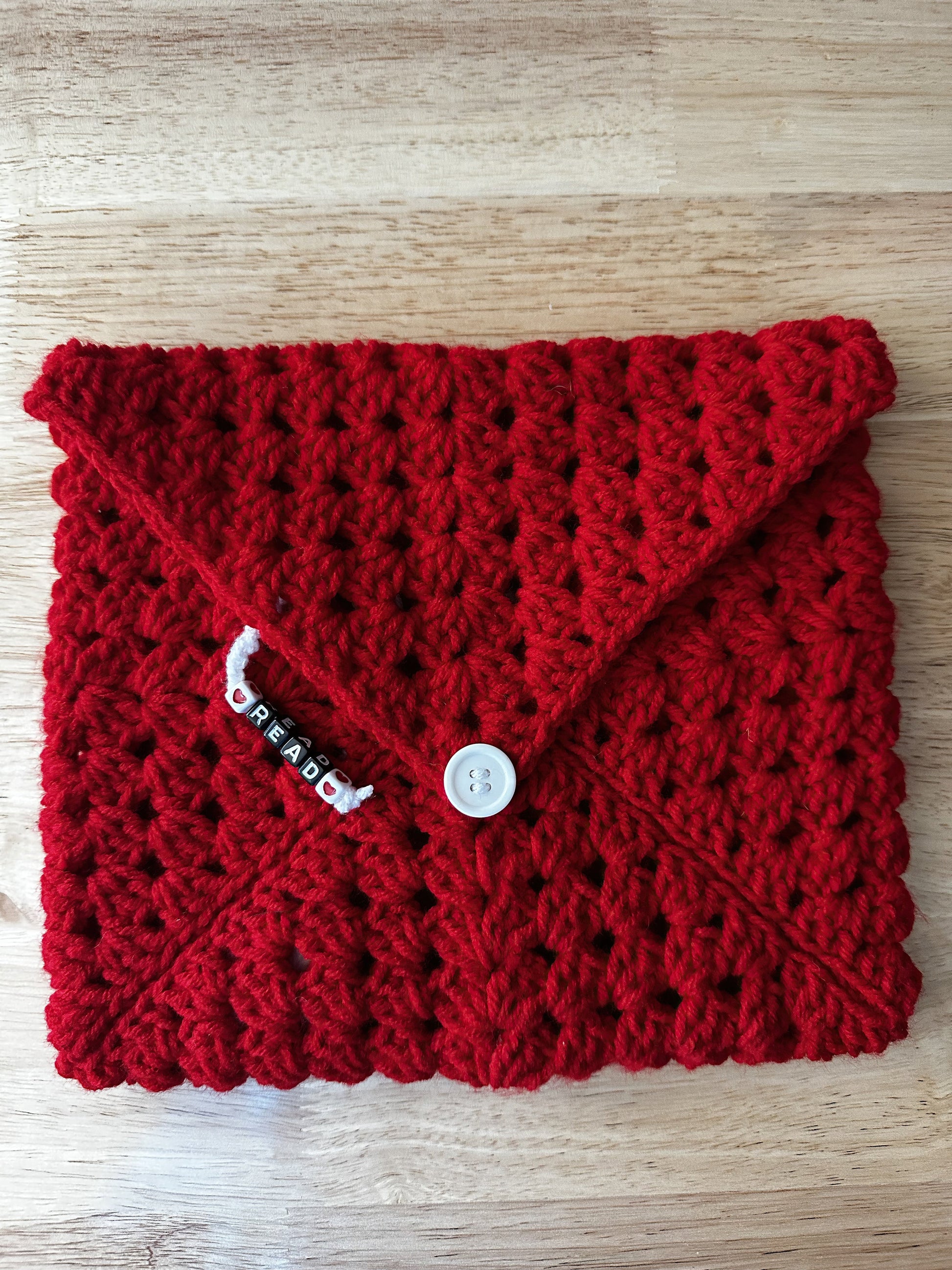 This charming handmade crochet book cover is crafted with soft, chunky yarn in a vibrant hues. It features a secure flap with a classic button closure for easy access to your reading material. Adding a personal touch, the pouch includes a decorative beaded accent. Ideal for storing small items like books, accessories, or keepsakes, this pouch is both practical and stylish.